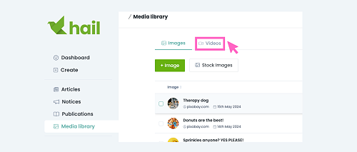 - Head to the Media library section in the main menu on the left-hand side. In this section, you can manage all your images and video links. You can add new images from your device, import new stock images and save videos from Vimeo or Youtube to share in your articles or website.