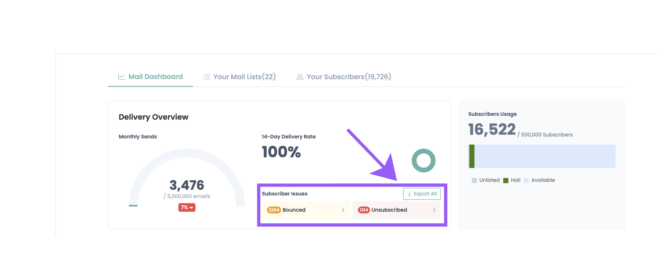 Go to Your Subscribers tab in the Hail Mail area of your dashboard.