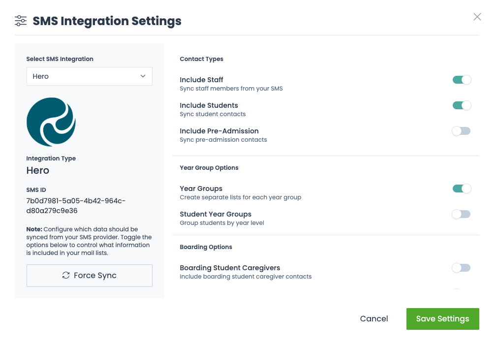 If your organisation uses a Student Management System (SMS), Hail Mail can automatically synchronise contact lists for parents, caregivers, staff, and students. This guide shows you how to manage your SMS integration settings and keep your lists up to date.