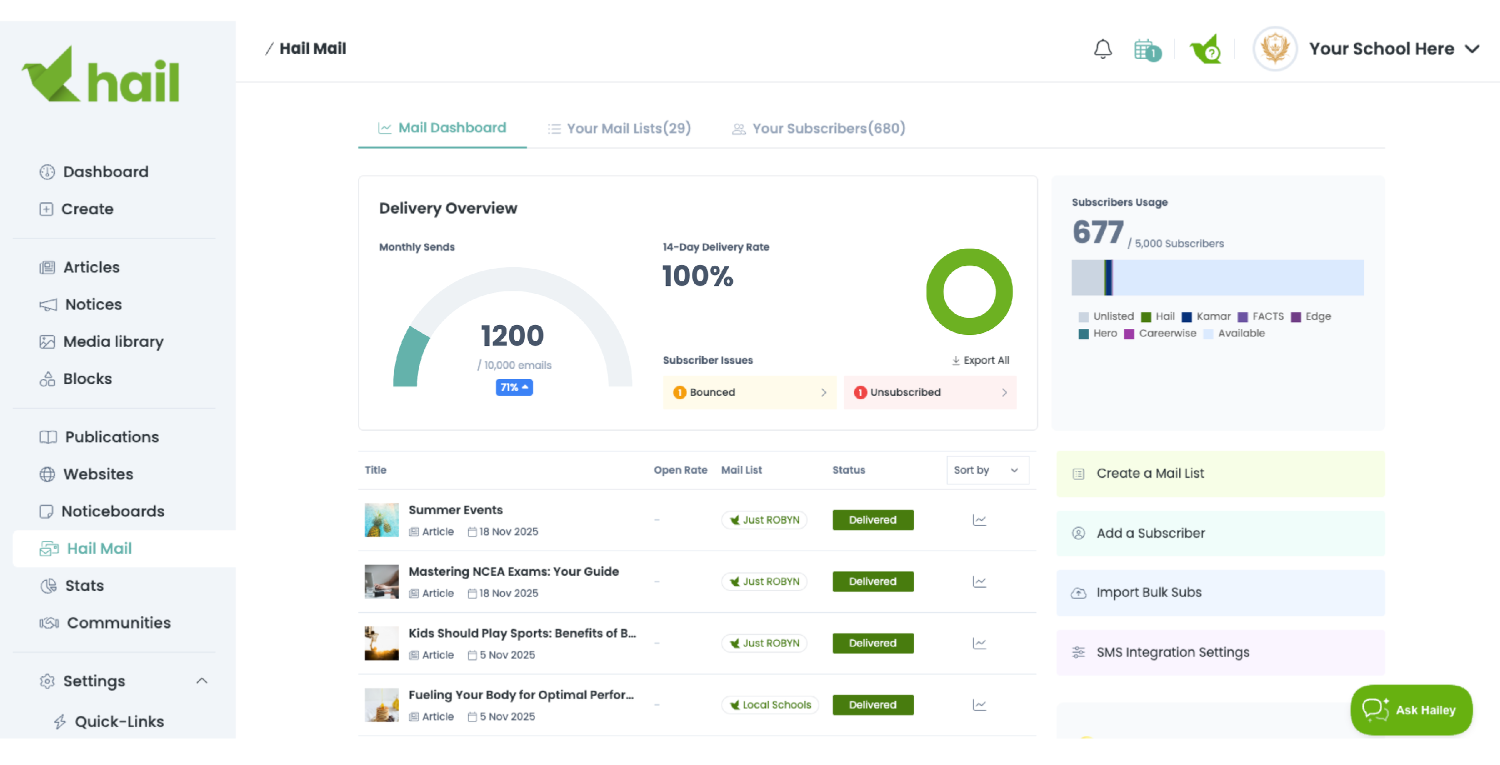 Sending notices, news and updates shouldn’t be a headache. With Hail Mail, you can effortlessly manage email campaigns and reach your audience with polished, professional communications.