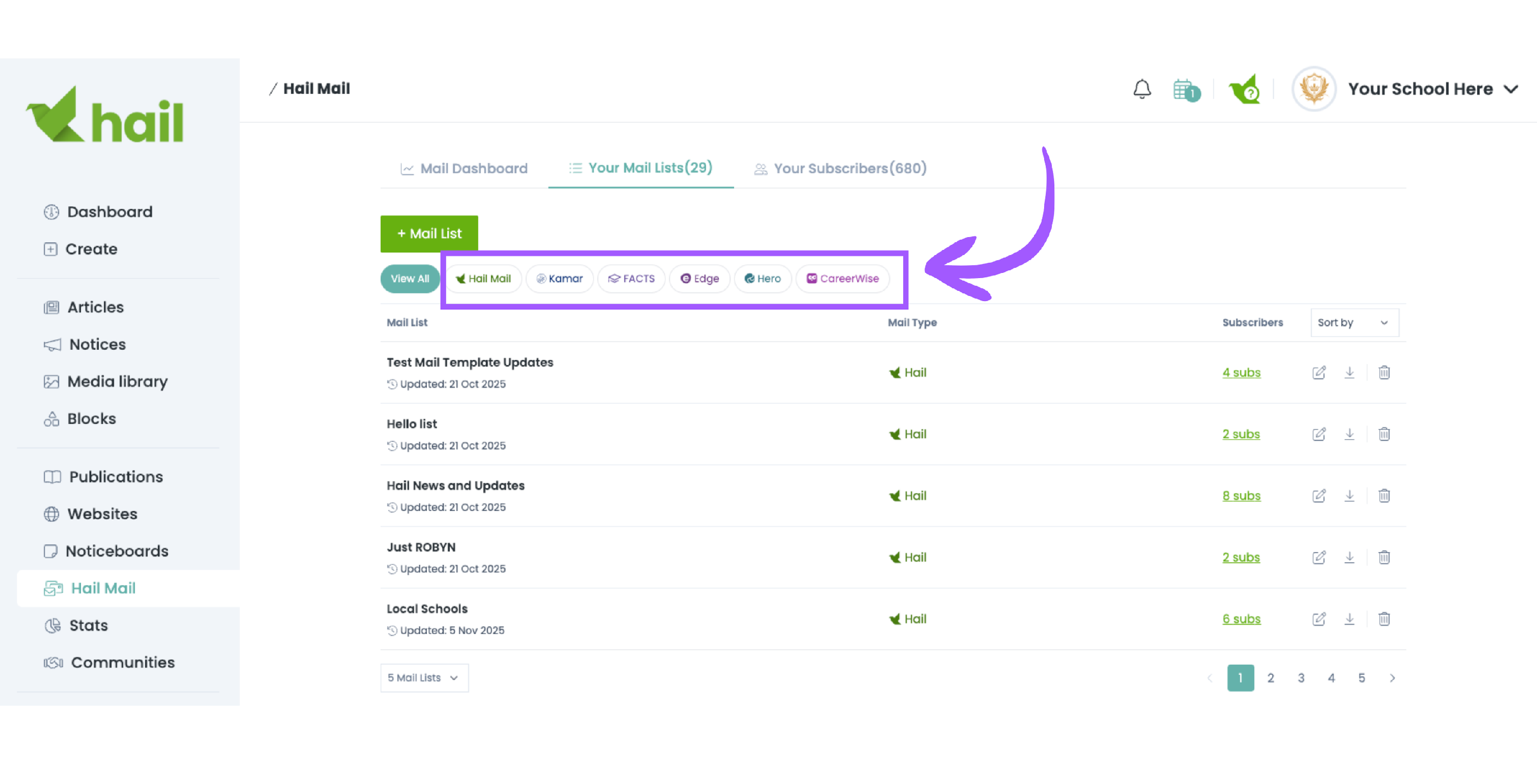 If your organisation uses a Student Management System (SMS) or other integrated platform, those subscriber lists automatically appear within your Hail Mail account. These lists sync contact information directly from your SMS provider — saving you from manual data entry and keeping information up to date automatically.