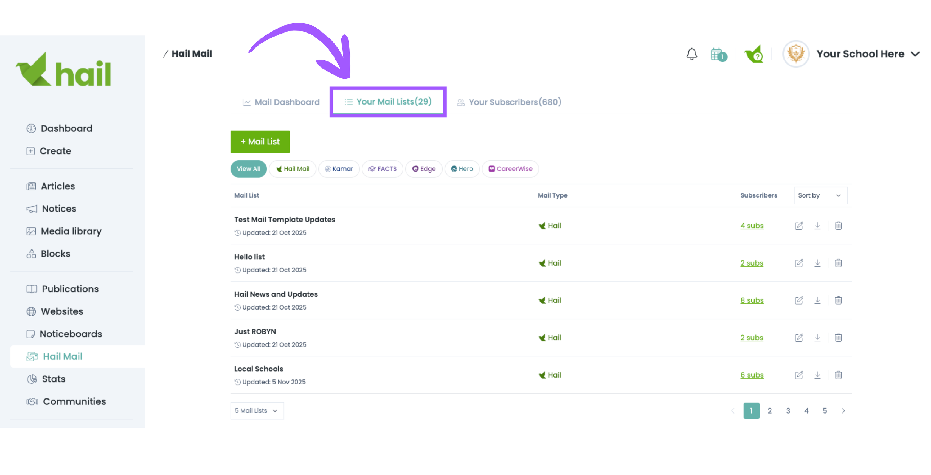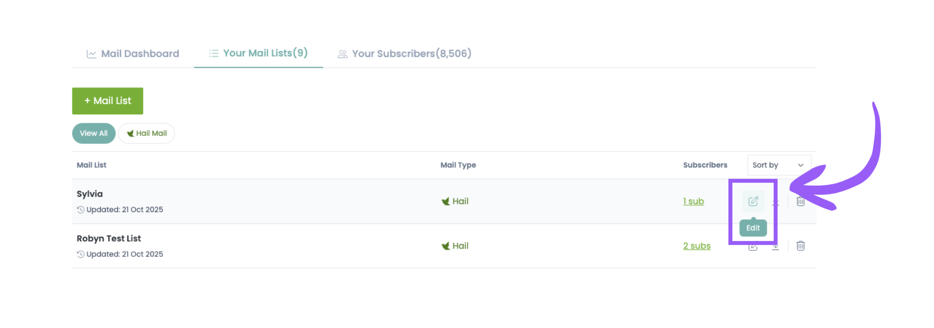 1. Access the Mail Lists section Navigate to "Hail Mail" from your main menu, then click "Your Mail Lists" tab.