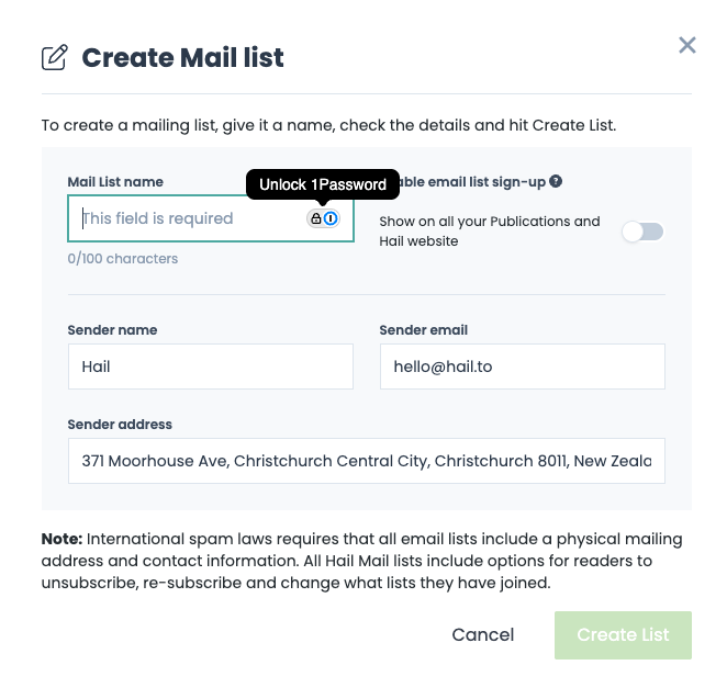5. Configure list settings Add a sender name and sender email address and then add your physical address. You can also toggle the option to add a 'sign up form' for this specific mailing list to be added to your content. This option works well if you have a public newsletter and would like to grow your readership.