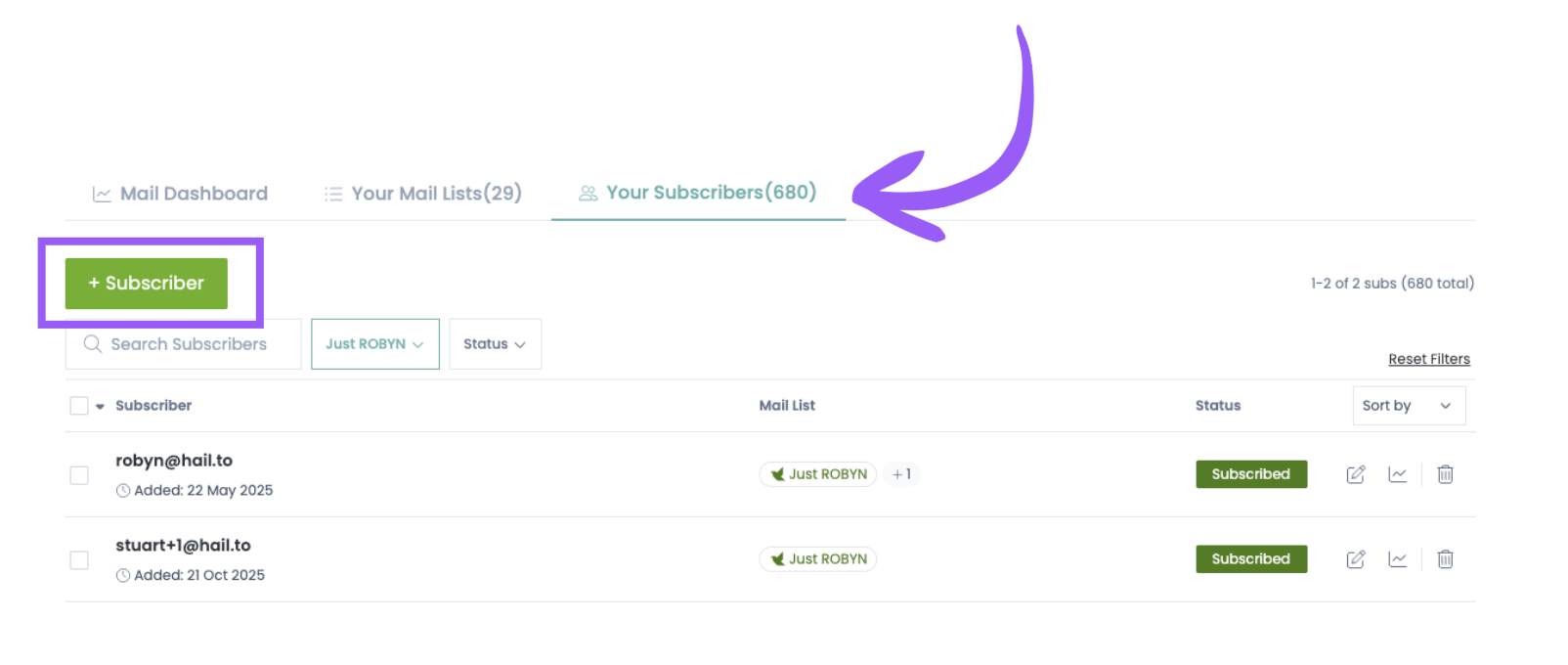 Viewing subscribers: Click on the green number of subs(shown in the box below) to see all subscribers on that list. From here you can search, filter by status (subscribed, bounced, unsubscribed), or perform bulk actions.
