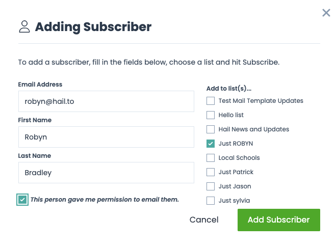 Adding subscribers: Go to the subscriber tab, Use the "+ Subscriber" button to add individual contacts, or "Bulk Import" to add multiple subscribers from a CSV file or by pasting email addresses. While uploading subscriber/s, you are asked to select a list to add them to, this is where you will specifically chose your mail list to ensure these contacts are added to the correct list.