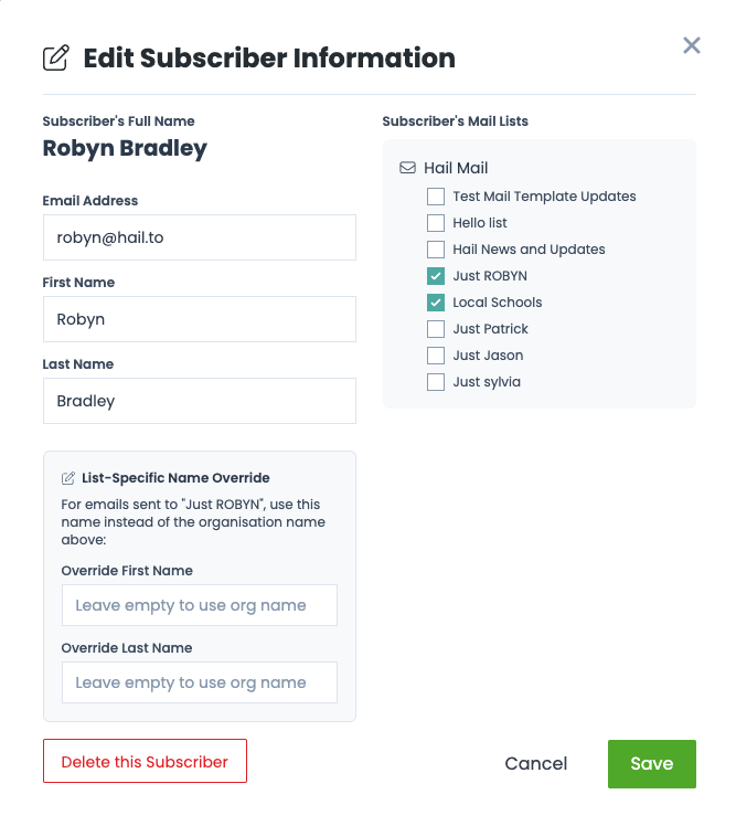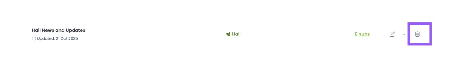 Important: Deleting a list removes all subscriber associations with that list, but the contact records themselves remain in your Hail account. Contacts will become "unlisted" if they're not on any other lists - you can view unlisted contacts in the Subscribers section and add them to other lists or remove them entirely.