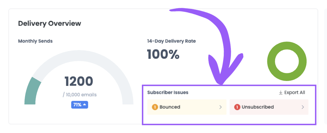 Export options: Download subscriber data for contacts with issues (bounced, unsubscribed, or spam complaints) from the dashboard, to review and clean your lists.