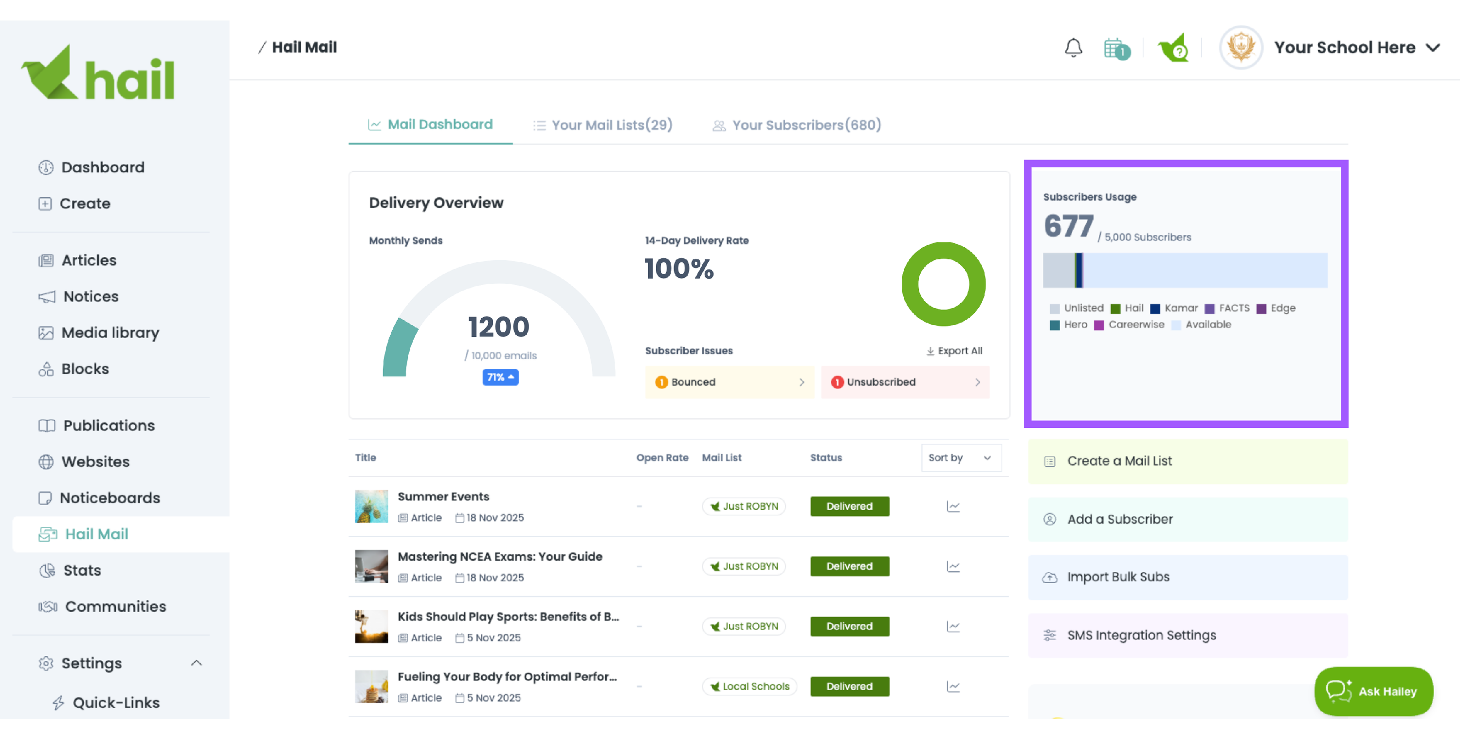 Your Hail Mail plan includes a subscriber limit - the total number of unique email addresses you can have in your account across all lists. The Hail Mail dashboard shows your current usage and available slots.