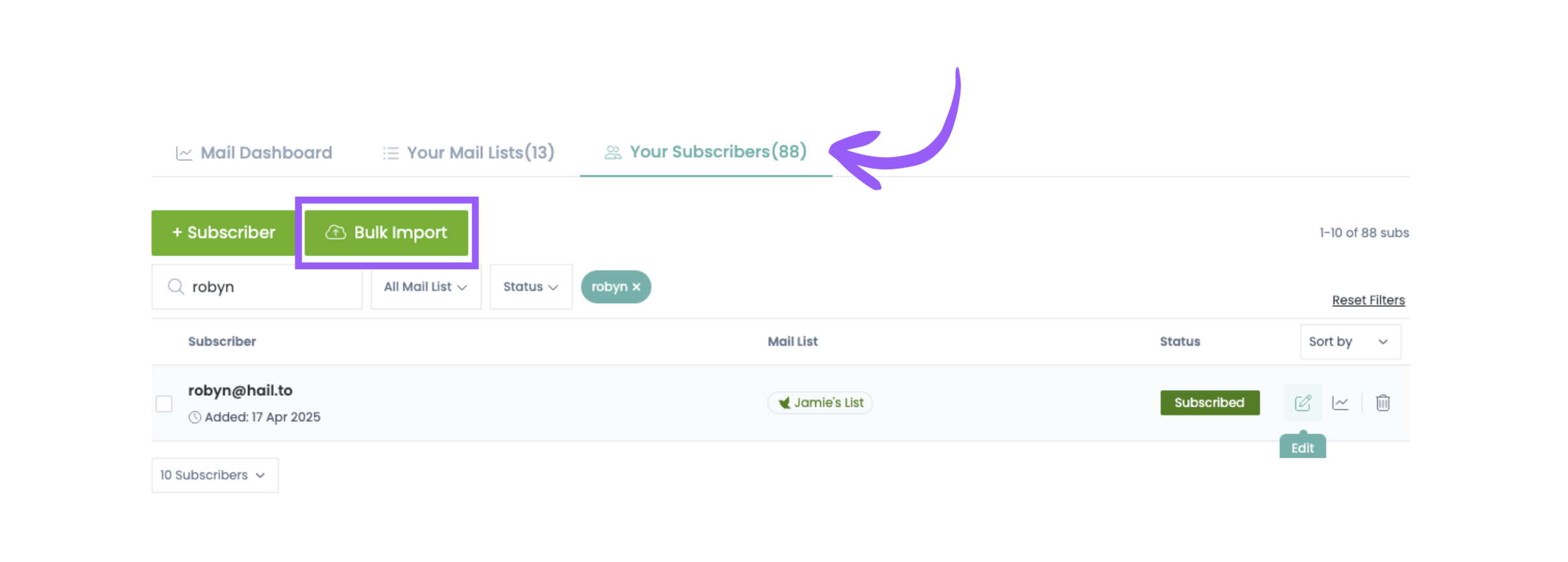 10. Verify your import After importing, navigate to "Your Subscribers" and filter by the list you imported to. You'll see all your newly added subscribers.