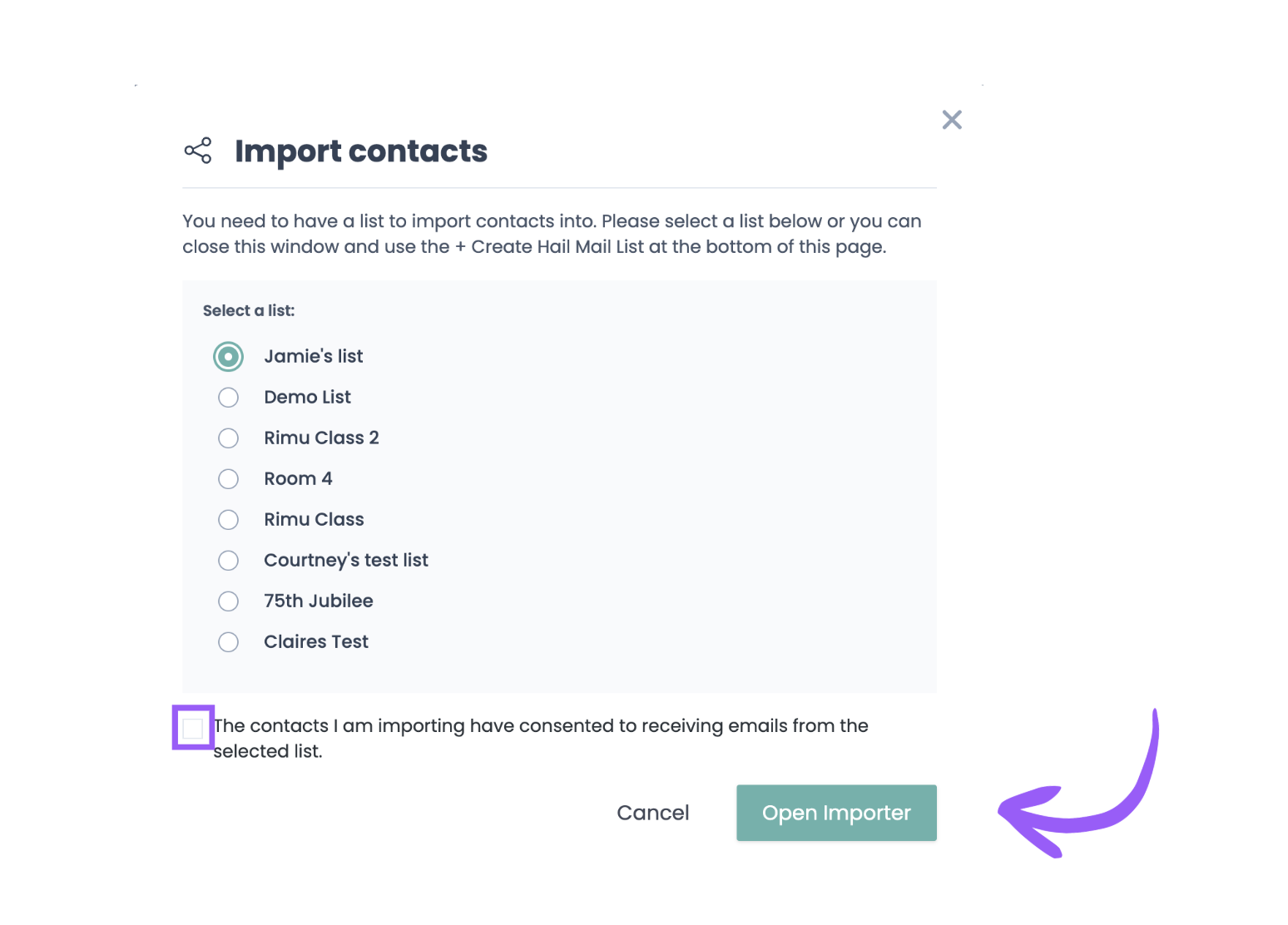 3. Confirm consent Check the box that says "The contacts I am importing have consented to receiving emails from the selected list." This confirmation is required for compliance with anti-spam regulations.