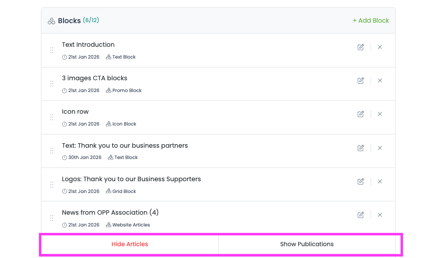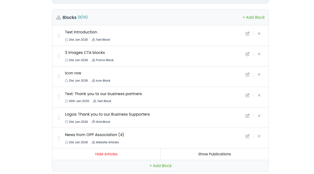 - You’ll see a list of all blocks on the page (for example: text blocks, image blocks, icon rows, logo grids, and news blocks).